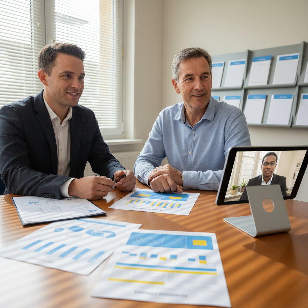 פגישה בבנק עם יועץ ויועץ נוסף בווידאו על טאבלט